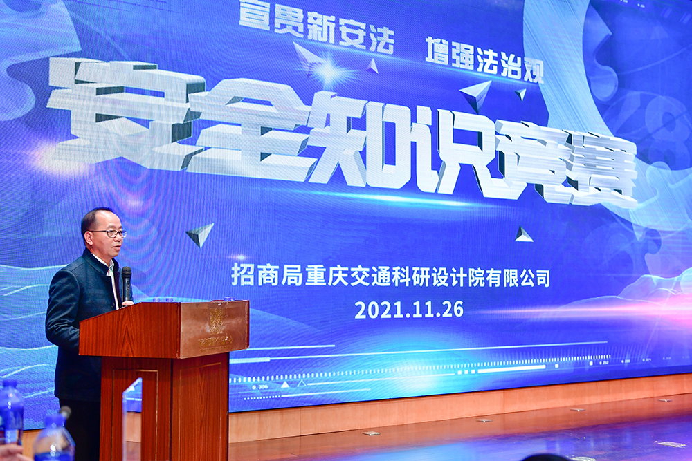 2021年11月26日,招商交科在重慶華商國際會議中心成功舉辦“宣貫新安法、增強法治觀”安全知識競賽。公司黨委書記、董事長劉偉出席活動并作講話,公司副總經理、總工程師彭金濤為本次活動致辭。公司黨委委員