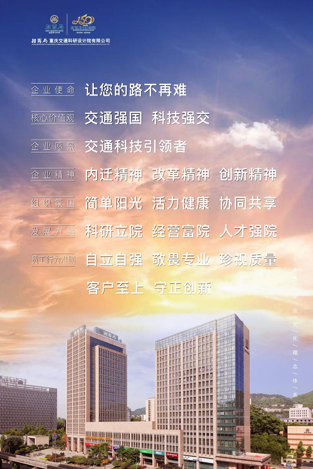 建院紀念日當天,招商交科在微信公眾號平臺上線了新時代招商交科企業文化理念體系電子海報,并組織在全公司各處顯示屏滾動播放,還印制紙質海報,組織本部各單位和下屬公司張貼于宣傳欄、文化走廊等處,以簡潔明了的形式彰顯招商交科的新面貌、新氣象。(招商交科供稿)