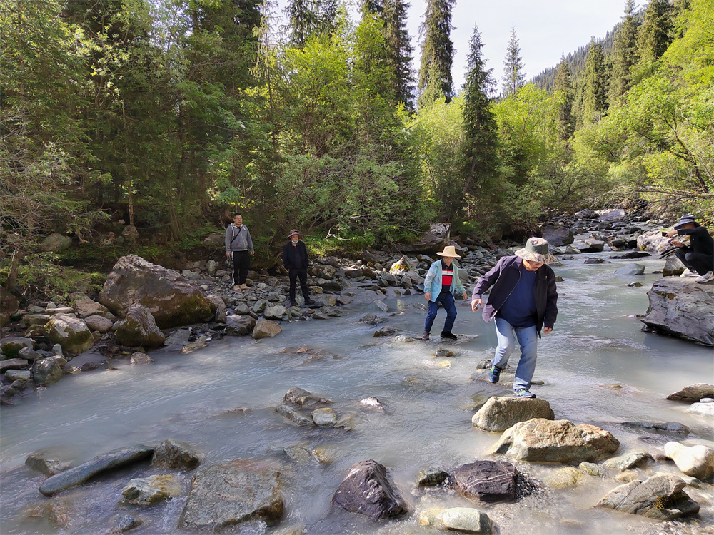 緊接著,項目組一行按規定隔離14天,為了不耽誤工作,隔離期間,項目組人員臨時搭了一個辦公室,抓緊時間開展前期工作。主動與地勘單位接頭,就勘察的數據進行了認真討論,并根據業主要求做好方案調整。隔離期結束后,項目組立即進入了踏勘工作,攀崖涉水,走泥路,鉆樹叢,雖然是萬物復蘇的五月,遠處卻是白雪皚皚的天山。雪山之下,寒風刺骨。時而大雨傾盆雷聲陣陣,時而驕陽似火炙熱灼灼,讓人深切體會到了那句老話——“早穿棉襖午穿紗,圍著火爐吃西瓜”。