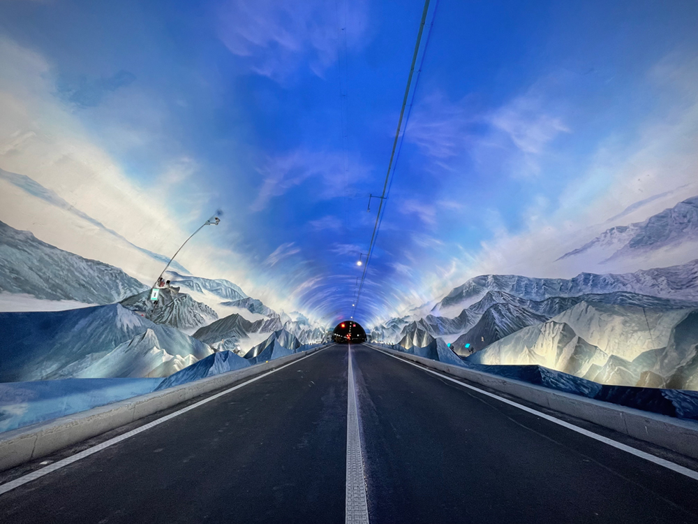 本次通車段共包含5個隧道,隧道洞門及洞內景觀由景觀與建筑設計院設計并實施。城開特長隧道長達11.5公里,是重慶市目前最長的高速公路隧道,其中景觀拓寬段通過“聲”、“光”、“畫”的方式,打造出國內首座純手繪“4D景觀”高速公路隧道。