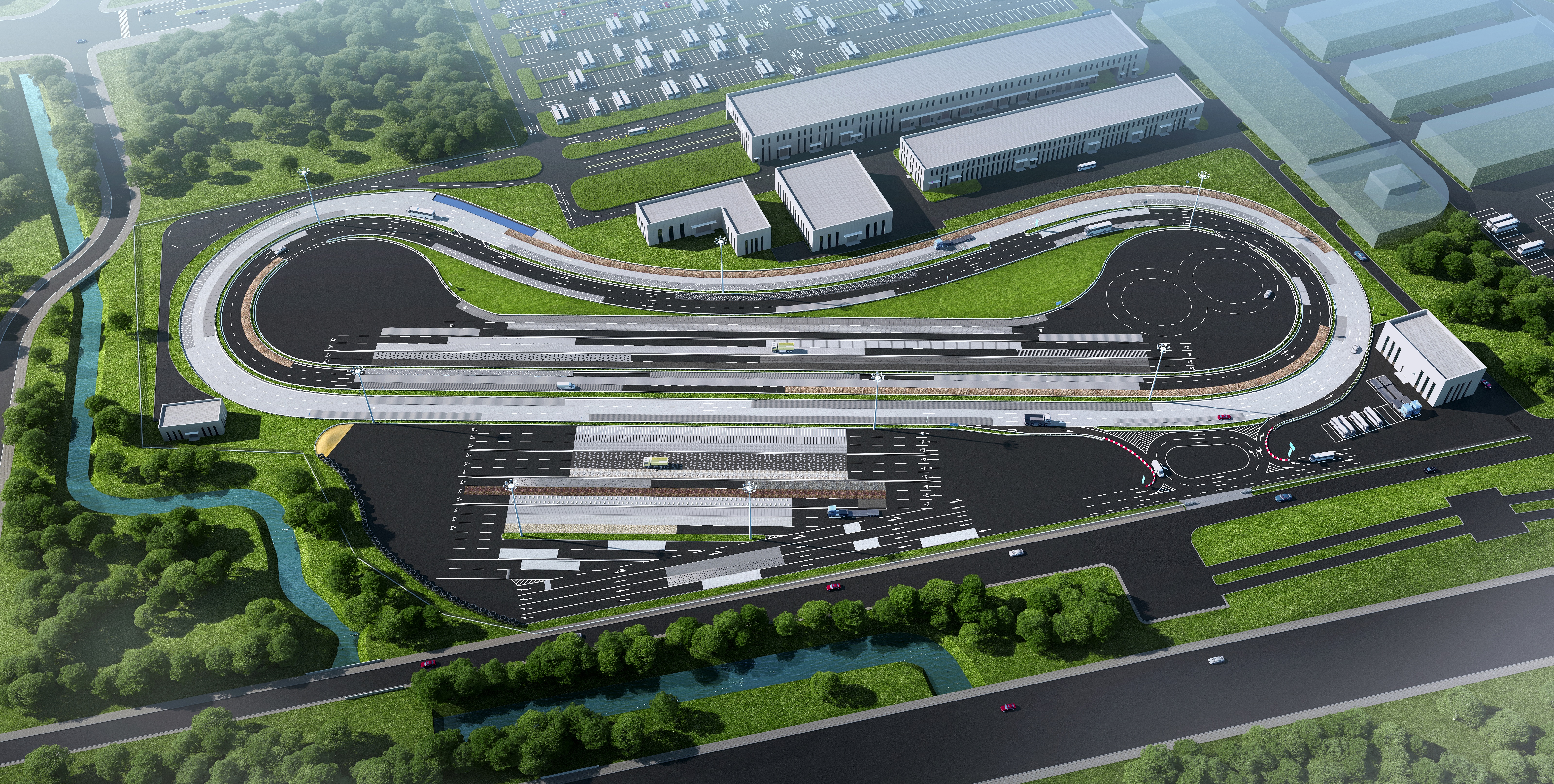 車檢院二期效果圖(鳥瞰圖) 新能源智能網聯汽車及智慧交通科技創新基地位于重慶市高新技術產業開發區金鳳電子信息產業園,總占地總面積16.76萬㎡,其中試驗道路占地7.89萬㎡,包括氣囊誤作用試驗道路、NVH評價試驗道路、強化耐久試驗道路等3個區域,涉及比利時路、維也納路、坑洼路、扭曲路、搓板路、波形路、顛簸路、凸塊路、魚鱗坑、卵石路等50多種特種道路。項目建成后,將用于汽車和摩托車新產品研究開發試驗、標準驗證及可靠性試驗、相關法規試驗等。