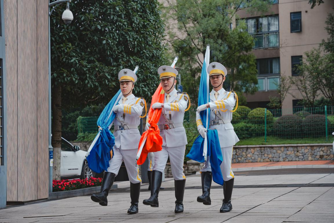 升旗儀式上,身著白色制服的儀仗隊員護(hù)著國旗、招商局旗,邁著整齊的步伐走向升旗臺。在《國歌》和《招商局之歌》的莊嚴(yán)歌聲中,五星紅旗和招商局旗先后冉冉升起,迎風(fēng)飛揚。
