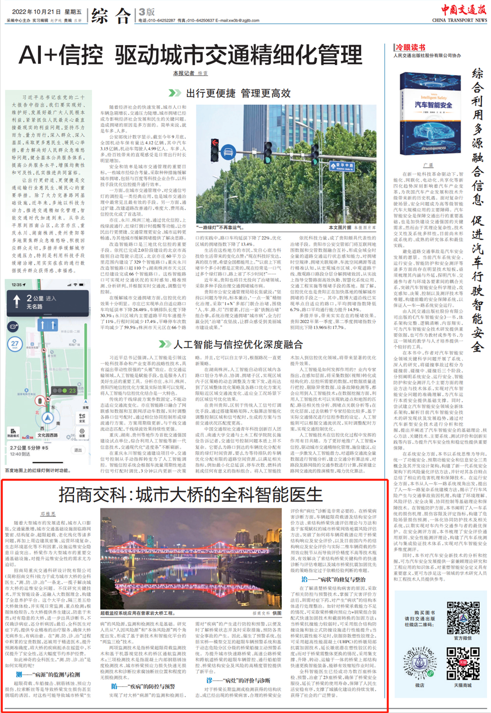 2022年10月21日,《中國交通報》在第三版以《招商交科:城市大橋的全科職能醫(yī)生》為題,全文刊發(fā)橋梁研究院文章,展現(xiàn)招商交科通過開發(fā)智能設備,融入大數(shù)據(jù)理念,構(gòu)建全息養(yǎng)護平臺等多種方式,解決城市大橋的運維安全問題,為建設交通強國、數(shù)字中國貢獻交科方案。