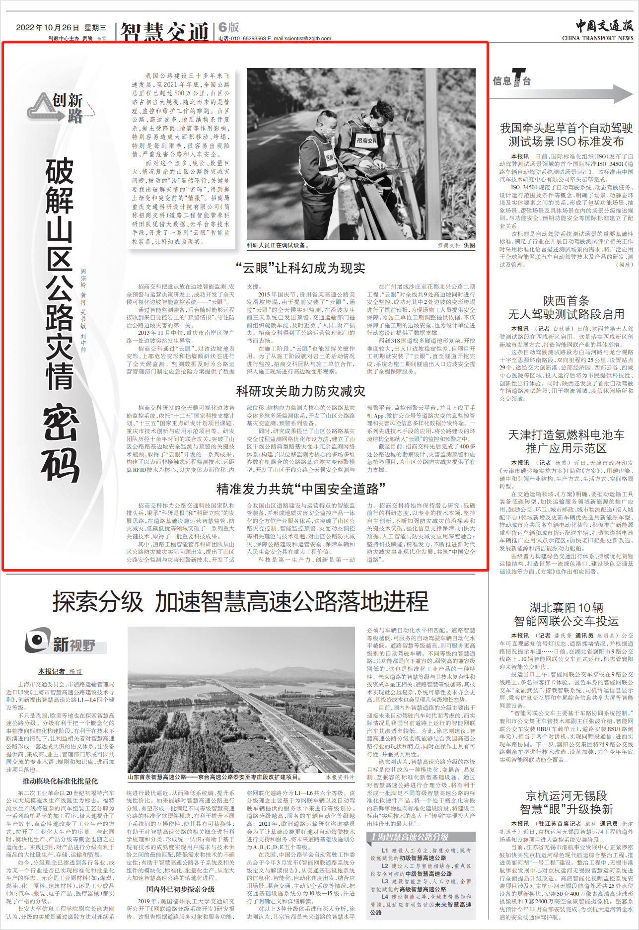 10月26日,《中國交通報》在第6版全文刊發道路研究院文章《破解山區公路災情“密碼”》,文章介紹了招商交科始終立足專業,堅持自主創新,加強防災減災前沿技術探索,強化信息支撐保障,加快大數據、人工智能與防災減災應用深度融合;堅持科技賦能,精準發力,不斷推進新時代防災減災事業現代化發展,共同助力“中國安全道路”。現將全文轉載如下: