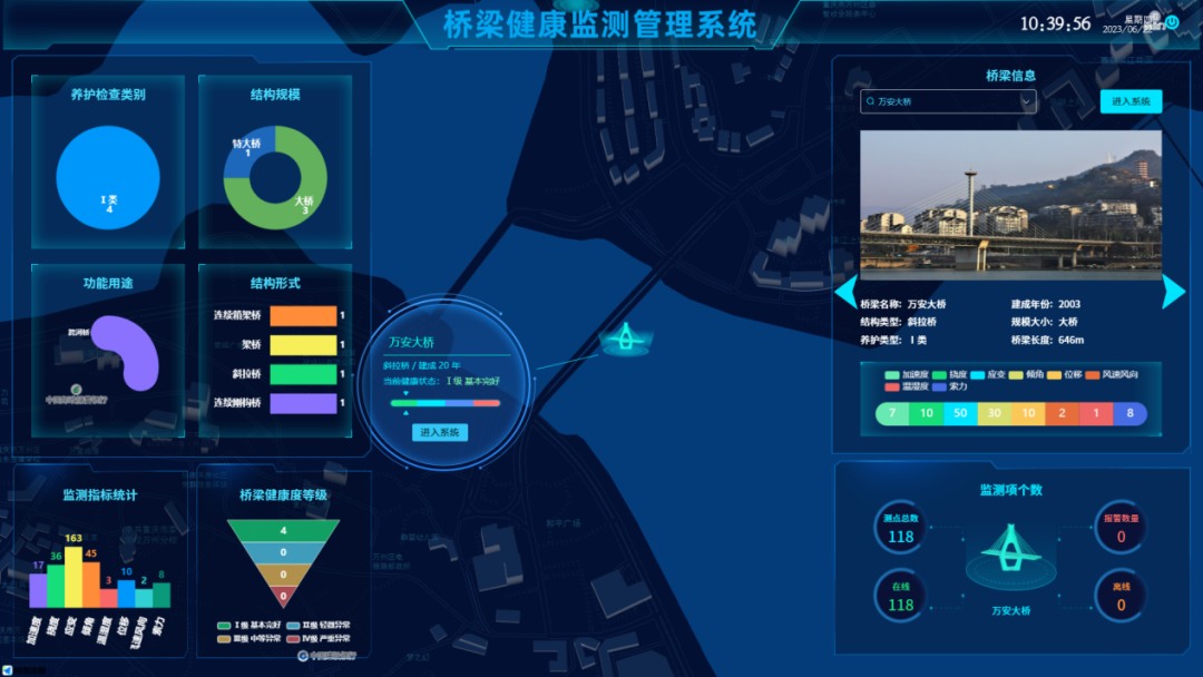 2023年1月,由招商交科主持設計的國內最大跨度公軌兩用懸索橋——重慶郭家沱長江大橋正式通車,基于“1+1+1+N”結構安全監測體系研發而成的物康科技新一代數字化產品“大型基礎設施結構安全智能監測平臺”同步發布并投入使用。該平臺集成數字資產管理、結構安全監測、車流量監測、全域視頻監控、異常事件檢測、巡檢管養、應急搶險7大功能;具備多場景、全生命周期管理,全要素、多尺度監測,跨層級、多端交互,邊緣計算、邊云協同,數字孿生、虛實交互,多環境、多云部署6大能力,擁有1套精細化閉環運營管理體系,可實現“一屏觀全域”“一網管全局”“一鍵統指揮”的效果,有效提升運營管理智能化、智慧化水平,實現橋梁管養降本增效。