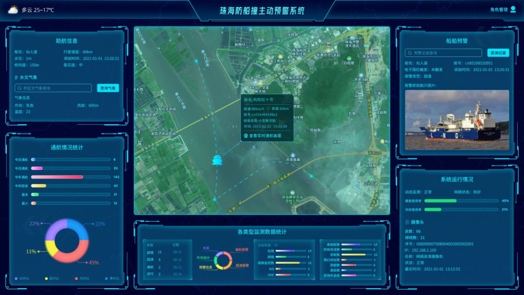 依托港珠澳大橋橋梁主體工程防船撞預警工程專項設計工作項目、珠海大橋主動防船撞項目,物康科技攻堅克難,研發出適用于超寬水域的紅外熱成像主動防船撞超高檢測裝置、船舶信息收發器等具有自主知識產權的行業專用裝備,形成基于AIS+微波雷達多源數據融合的船舶偏航檢測等技術;破解了超寬水域超高檢測單一數據來源偏航檢測結果的實時性與可靠性不可兼得,通航環境復雜、氣候條件惡劣的海洋環境下跨江(海)特大橋主動防船撞預警等行業難題;做到多種監測技術集成、多源數據融合、多層次區域預警,有效提高了橋梁和航道的運營安全管理水平。