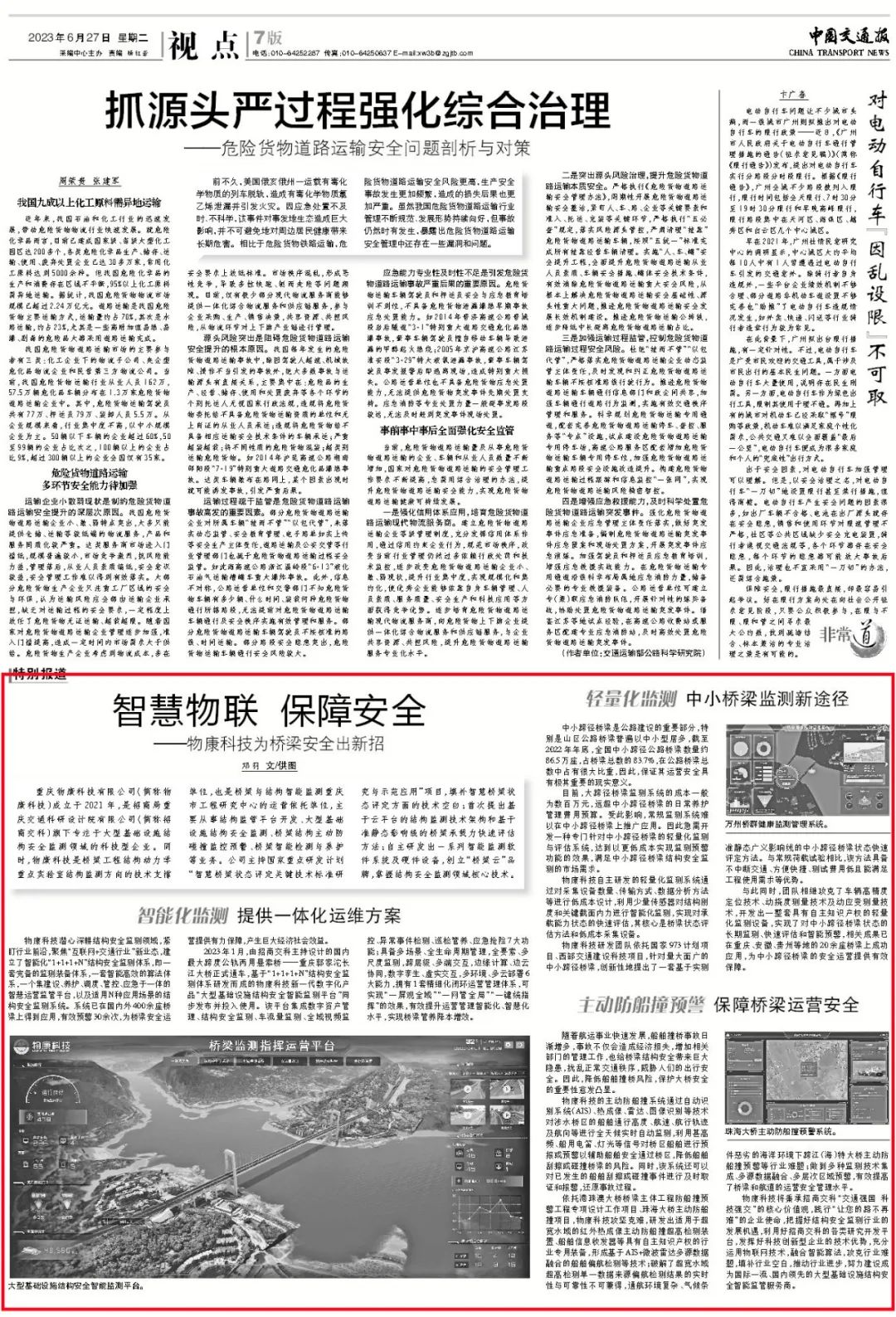 6月27日,在物康科技成立2周年之際,《中國交通報》在第七版和微信公眾號全文刊發了文章《智慧物聯 保障安全——物康科技為橋梁安全出新招》。文章詳細介紹了物康科技在結構監管平臺開發、大型基礎設施結構安全監測、橋梁結構主動防碰撞監控預警、橋梁智能檢測與養護等領域的技術和能力。現將全文轉載如下: