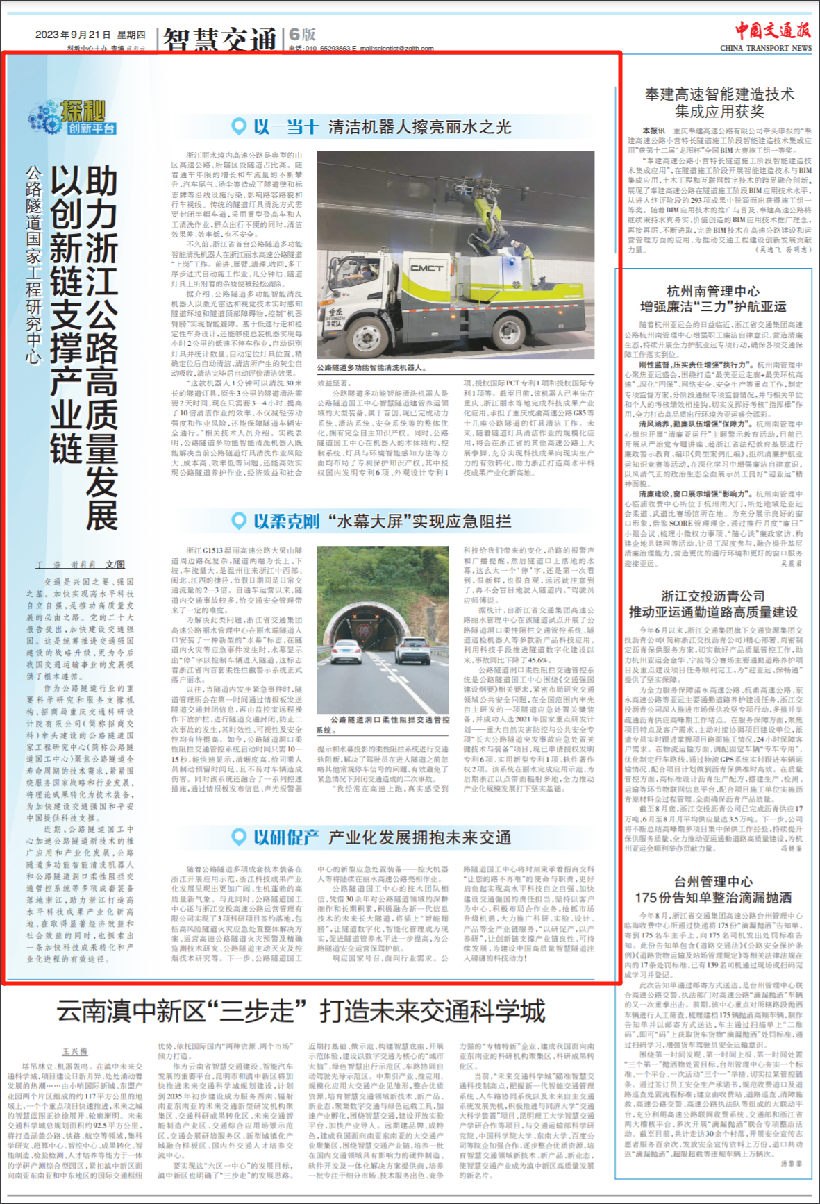2023年9月21日,《中國交通報》在第6版以《創新鏈支撐產業鏈發展 公路隧道國家工程研究中心助力浙江打造高水平科技成果產業孵化新高地》為題,刊發了招商交科公路隧道國家工程研究中心有關報道。報道聚焦長大公路隧道成套技術裝備的示范應用,介紹招商交科“公路隧道多功能智能清洗機器人”“公路隧道洞口柔性阻攔交通管控系統”等裝備落地浙江,并與浙江地方企業展開科研項目合作,助力浙江打造高水平科技成果產業化新高地,加速我國公路隧道新技術的推廣應用和產業化發展的具體情況。現將全文轉載如下:
