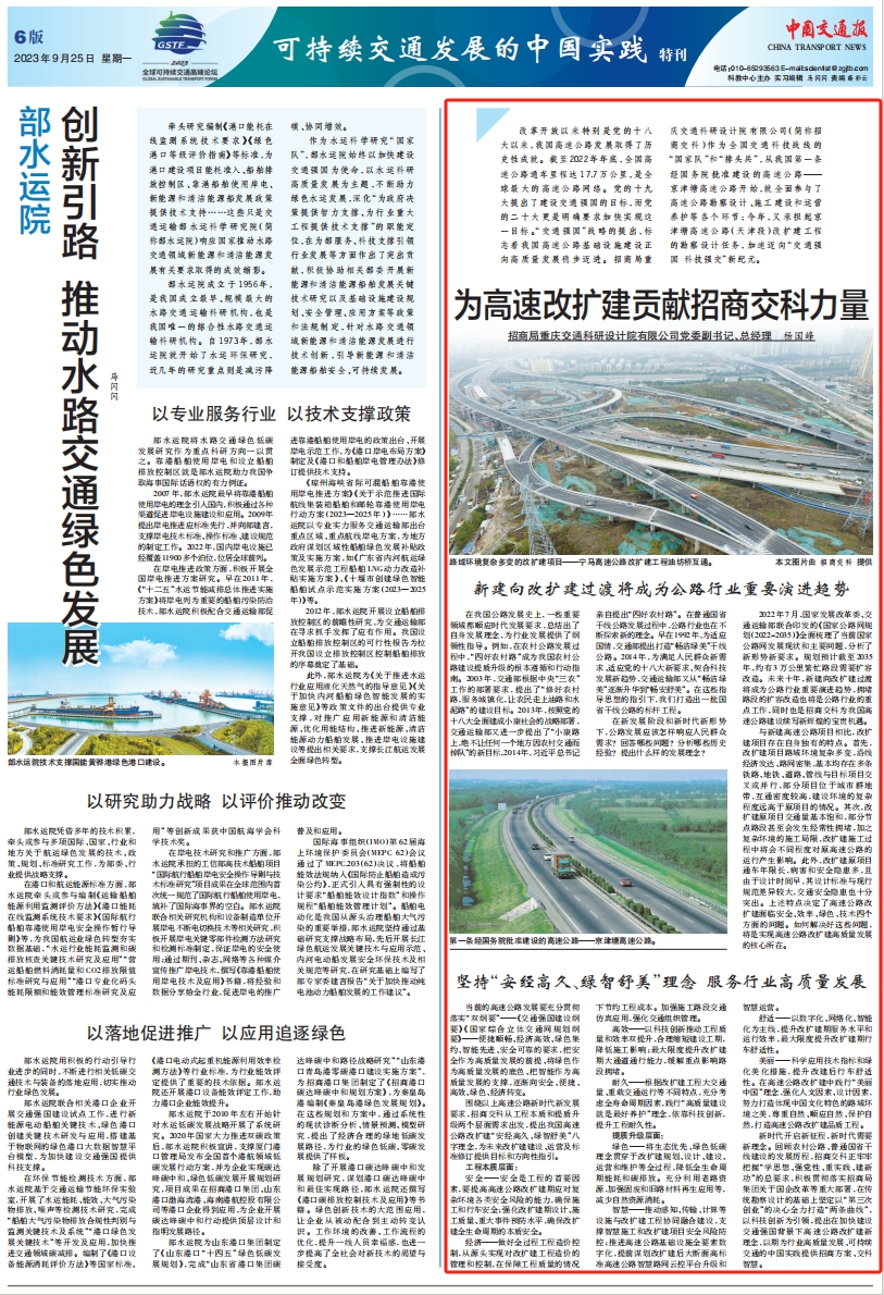 9 月 25 日,《中國交通報》在第六版《可持續交通發展的中國實踐》特刊,全文刊發了招商交科黨委副書記、總經理楊國峰的署名文章《為高速改擴建貢獻招商交科力量》。