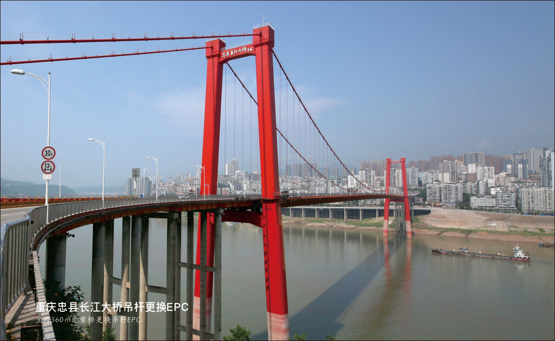 忠縣長江大橋位于重慶市忠縣國道G350上,橋梁全長1199.73m,橋跨布置為5×17m+2×28m+560m+10×49.10m,主橋?yàn)閱慰?60m鋼管桁架加勁梁懸索橋。